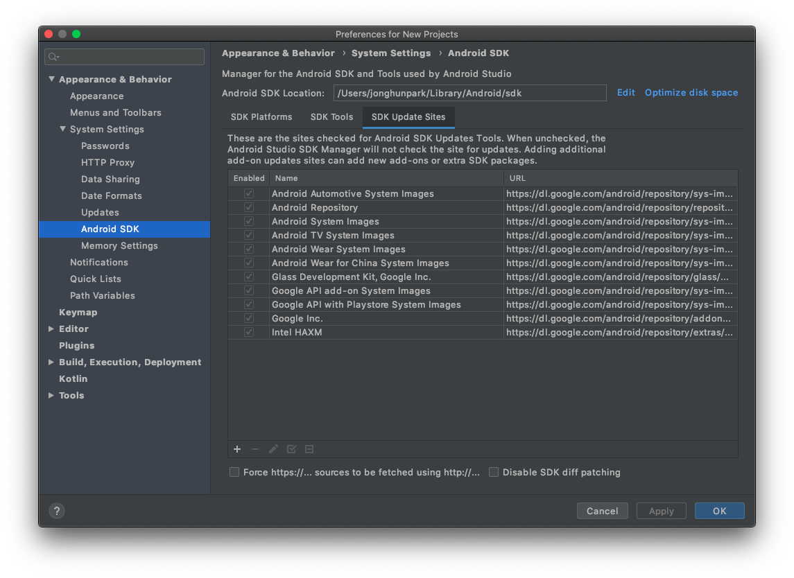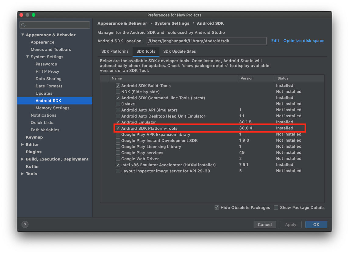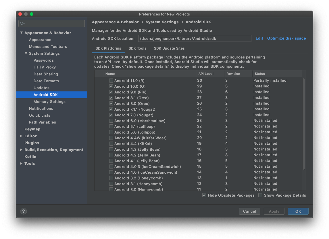 맥 OS 의 경우, ~/Library/Android/sdk 경로에, Windows 의 경우 c:\Users\{사용자명}\AppData\Local\Android\Sdk 경로가 기본값입니다. ↩