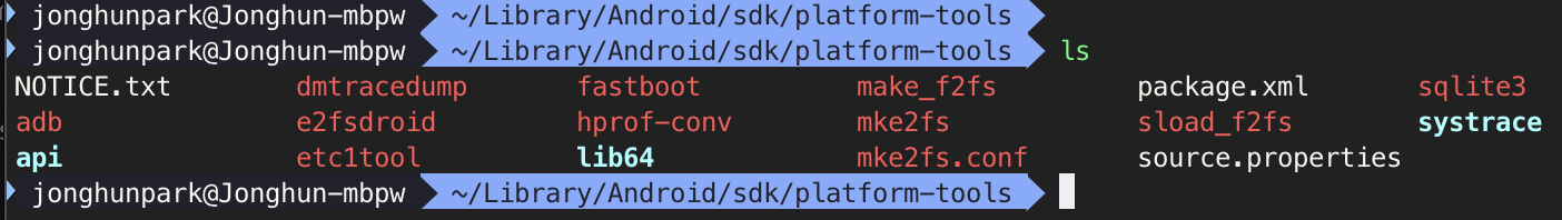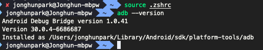 다시 해당 파일을 로드하고 adb --version 명령어를 입력하여 제대로 설정되었는지를 확인합니다.