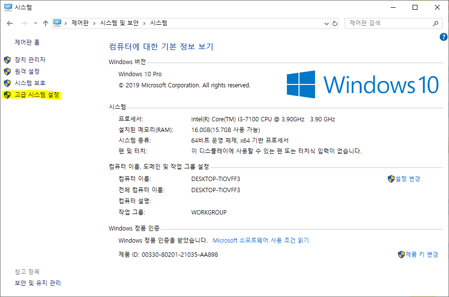 우선 제어판 > 시스템에 진입합니다. (win키를 눌러 시작 메뉴가 올라온 상태에서 ‘제어판’을 입력하면 됩니다) 그리고 고급 시스템 설정을 누릅니다.