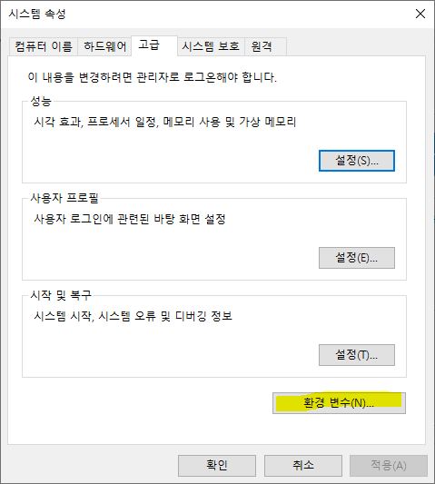 아래 버튼 중 ‘환경 변수’를 누릅니다.