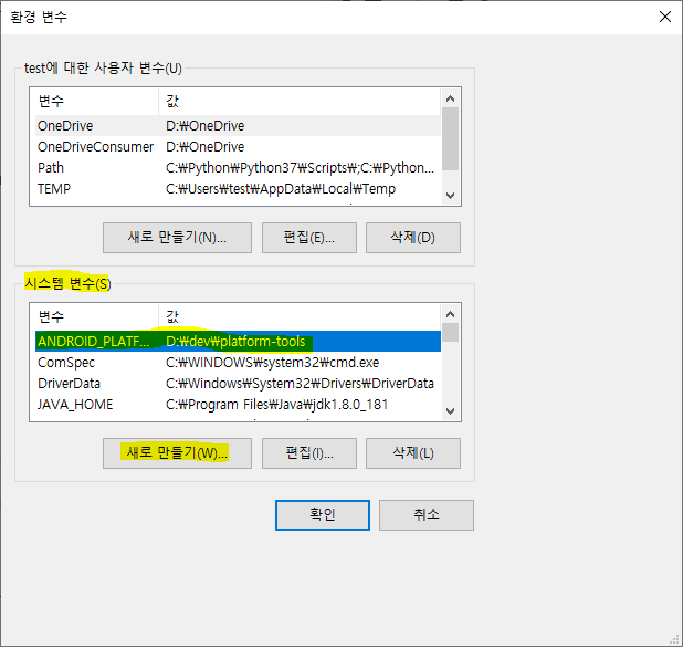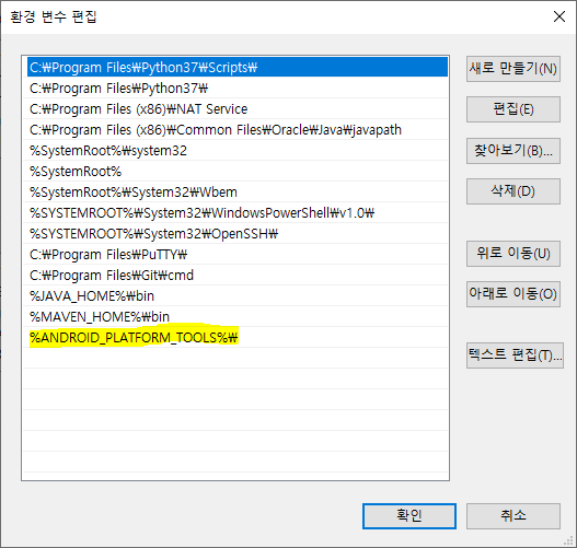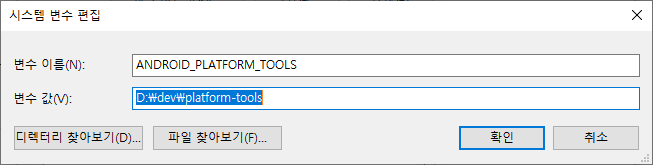 c:\Users\\{사용자명}\AppData\Local\Android\Sdk\platform-tools가 될 것입니다. ‘확인’을 눌러 빠져나옵니다.