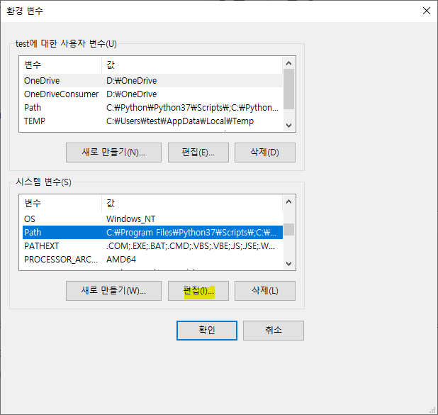 이제 ‘시스템 변수’ 영역에서 Path 라는 값을 찾습니다(99.99%확률로 있습니다. 만약 없다면 만들어주면 되지만, 잘 찾아보세요.) 그리고 ‘편집’을 눌러줍니다.