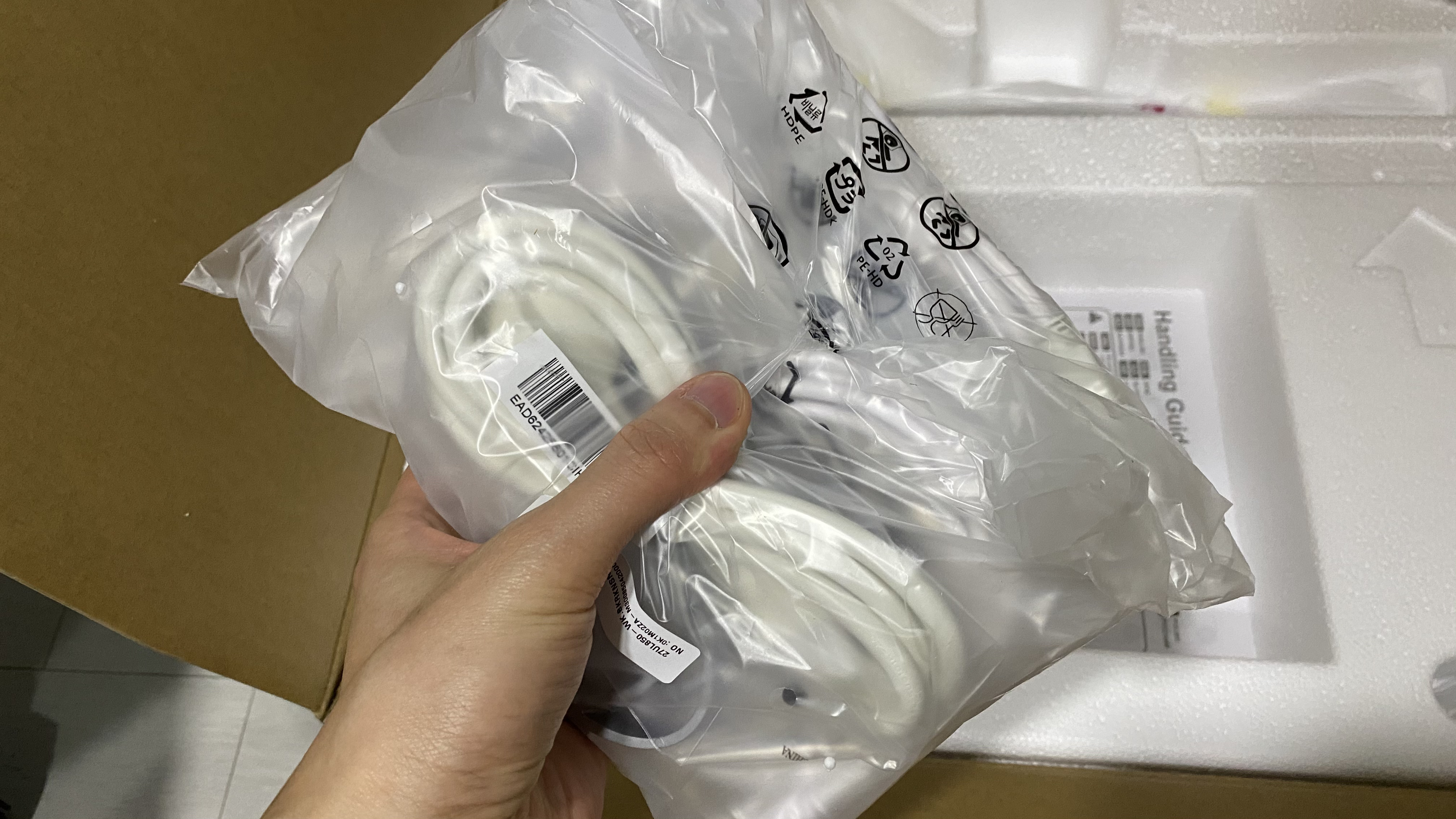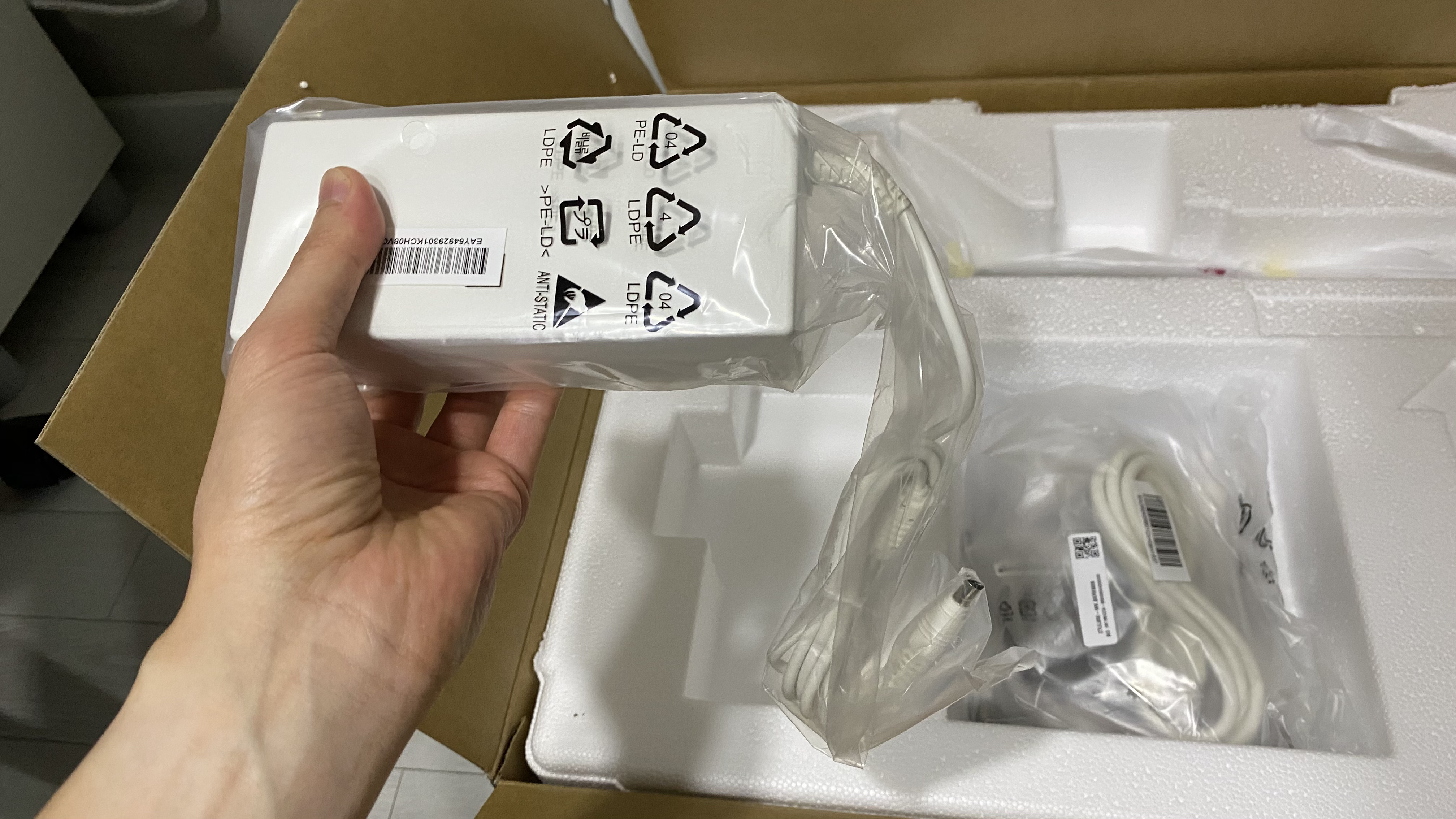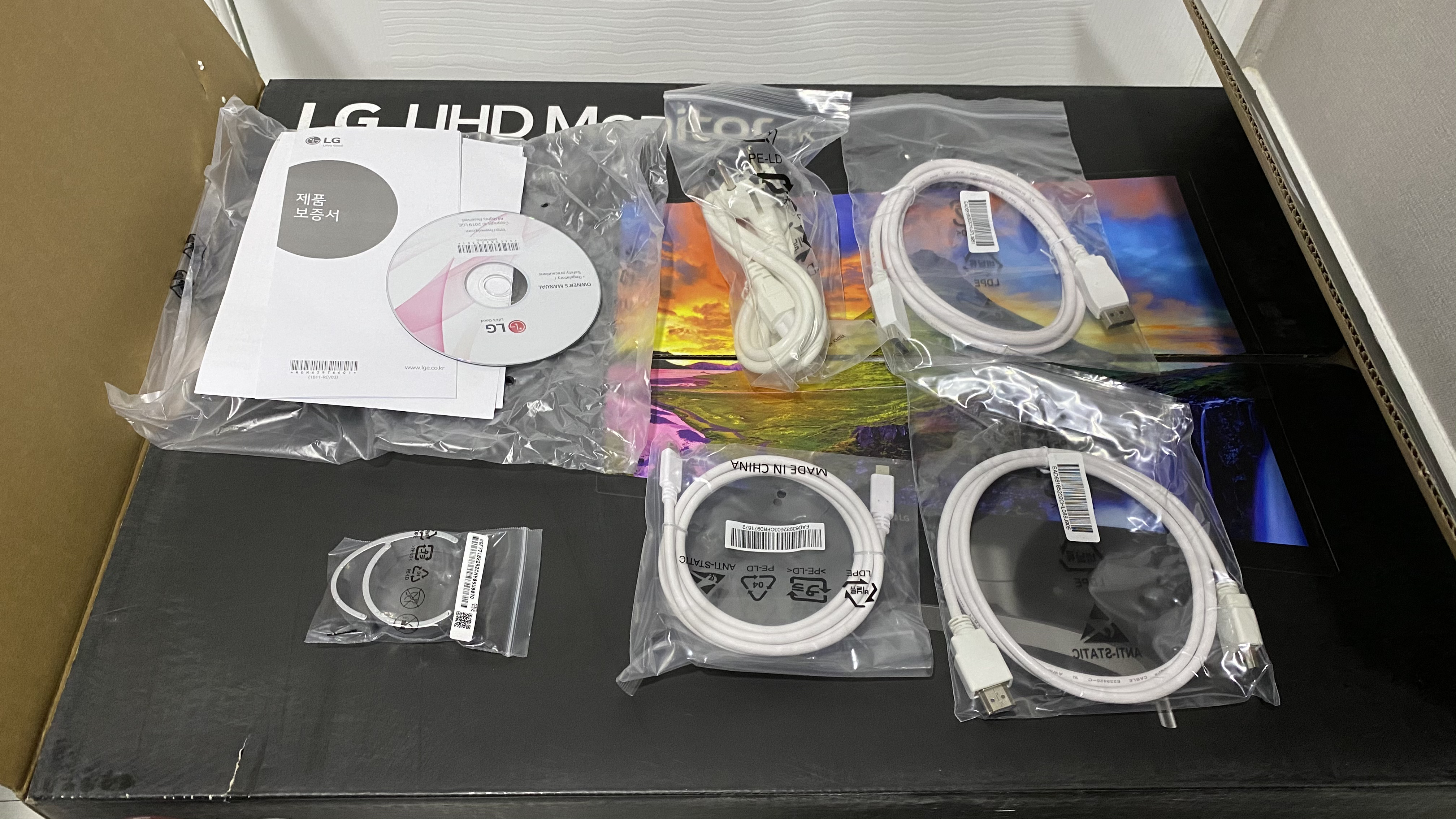 개봉을 해보면 모니터 받침대, 설명서와 각종 케이블들이 자리잡고 있습니다. 저는 모니터 암을 사용하고 있기 때문에 받침대 다리와 기등에 해당하는 부품은 꺼내 보지도 않았습니다. 나머지 케이블들 중에서도 USB-C to USB-C 케이블 1개와 전원 케이블만 꺼냈을 뿐 나머지는 그대로 남겨 두었습니다.