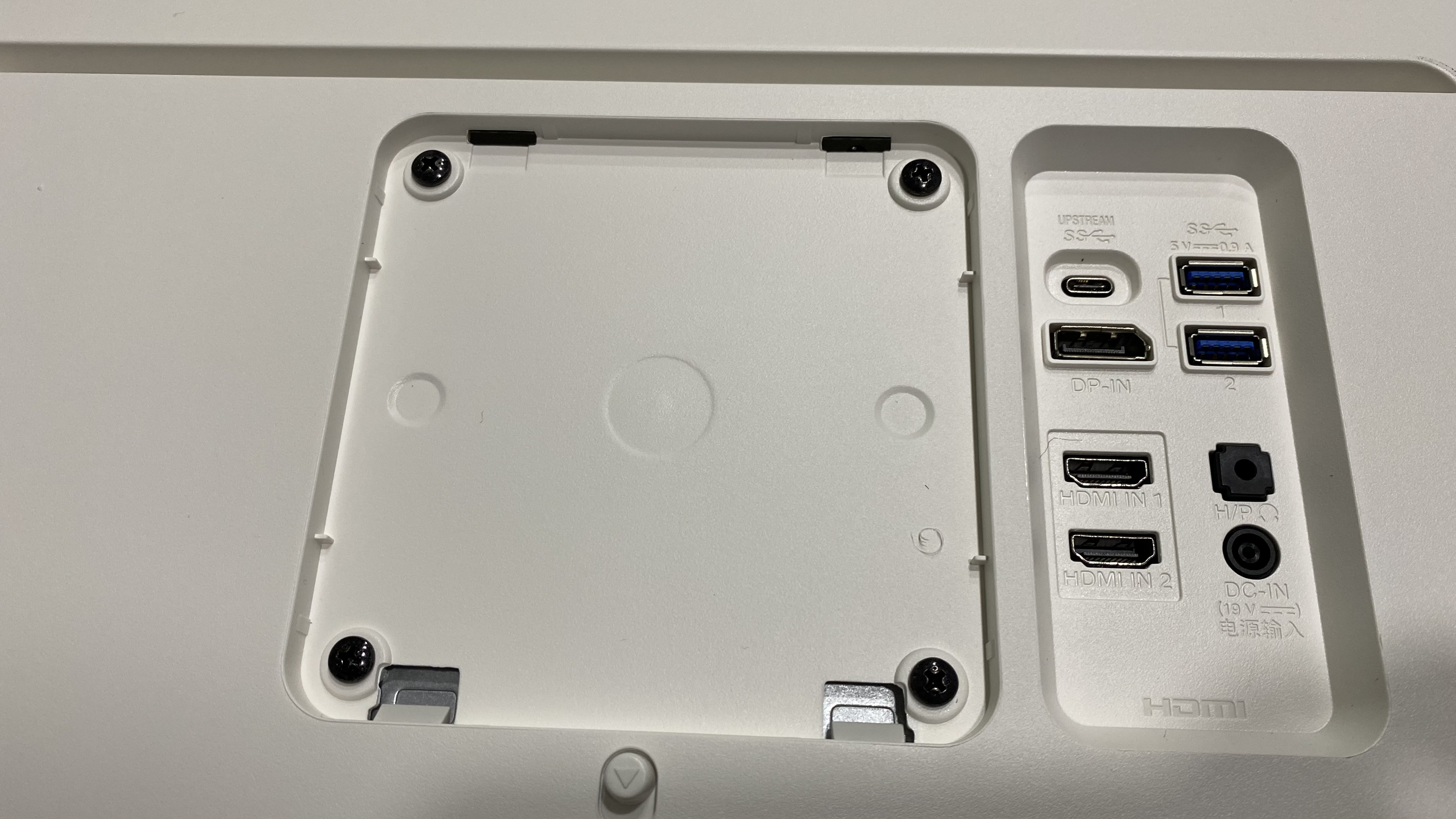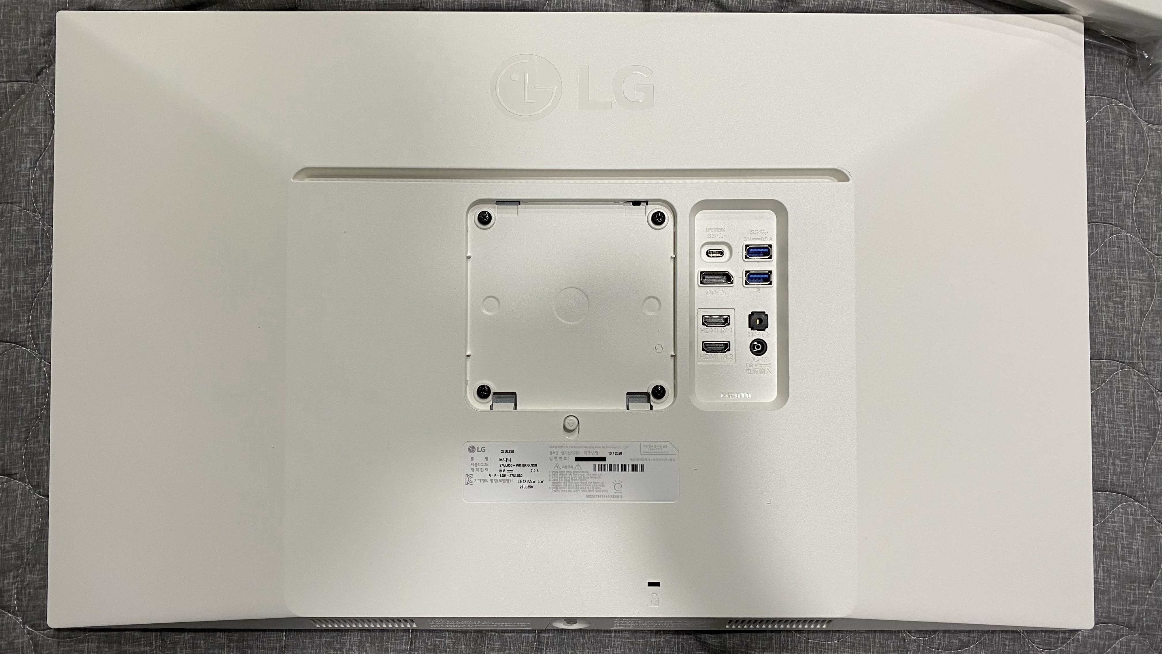 뒷면의 모습입니다. 다른 것보다 왜 흰색을 고집하는지 모르겠다는 생각입니다. 가지고 다니는 노트북 같은 것들이야 흰색이 워낙 깔끔해 보이기 때문에 미관적인 이점이 있을 수 있겠지만 모니터 후면을 흰색으로 하는 것은 아직도 왜 그런지 의문입니다.