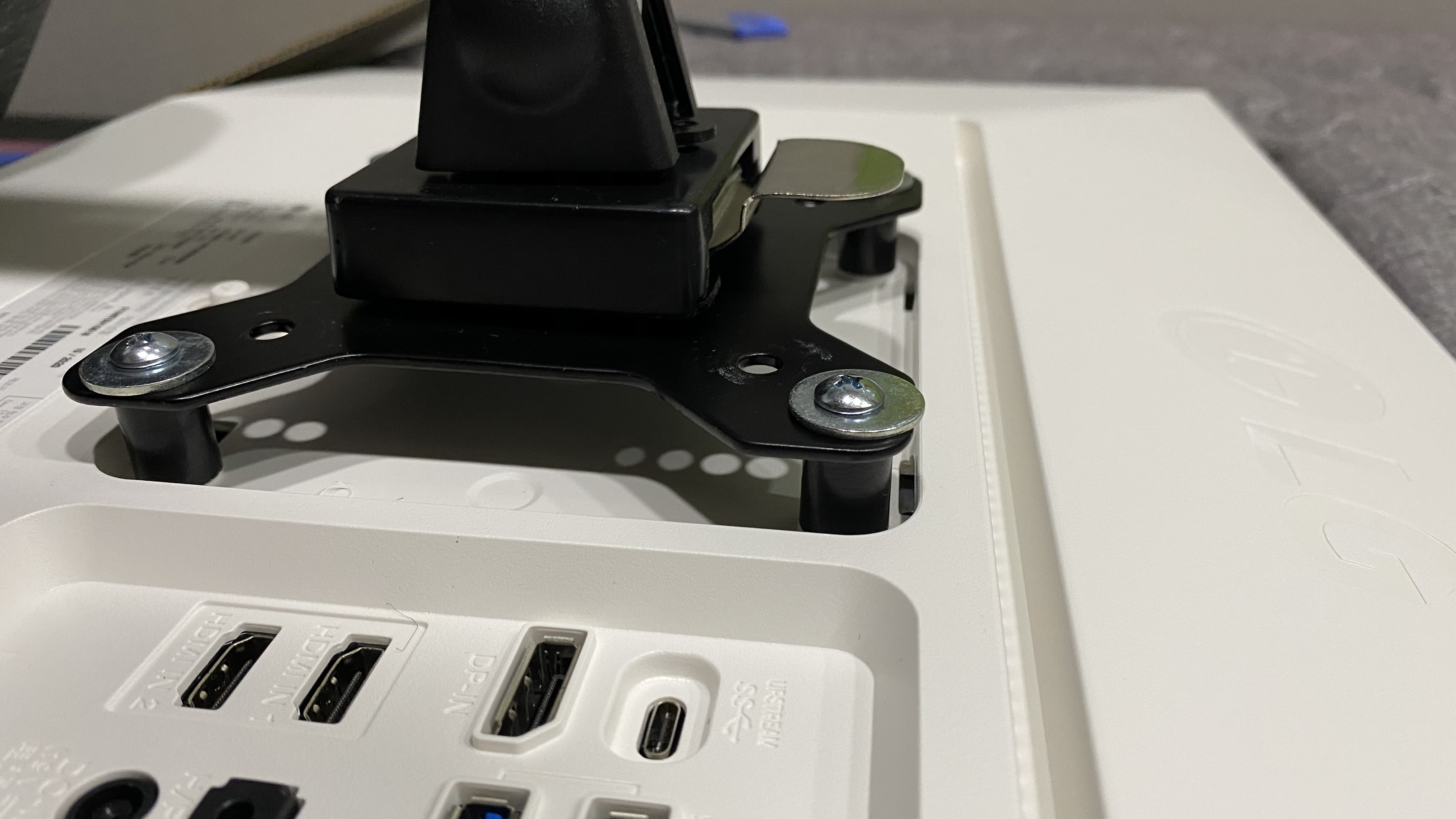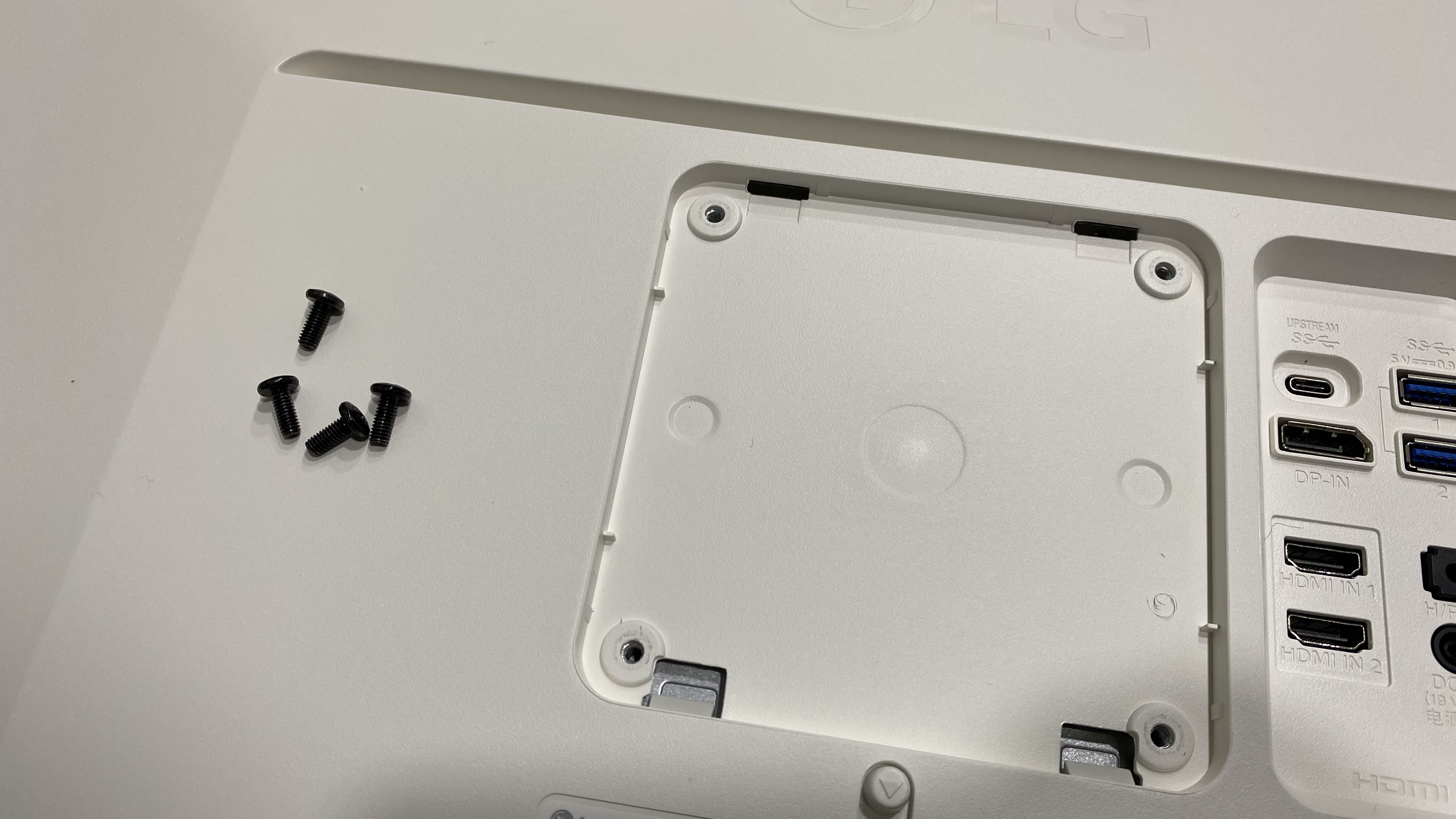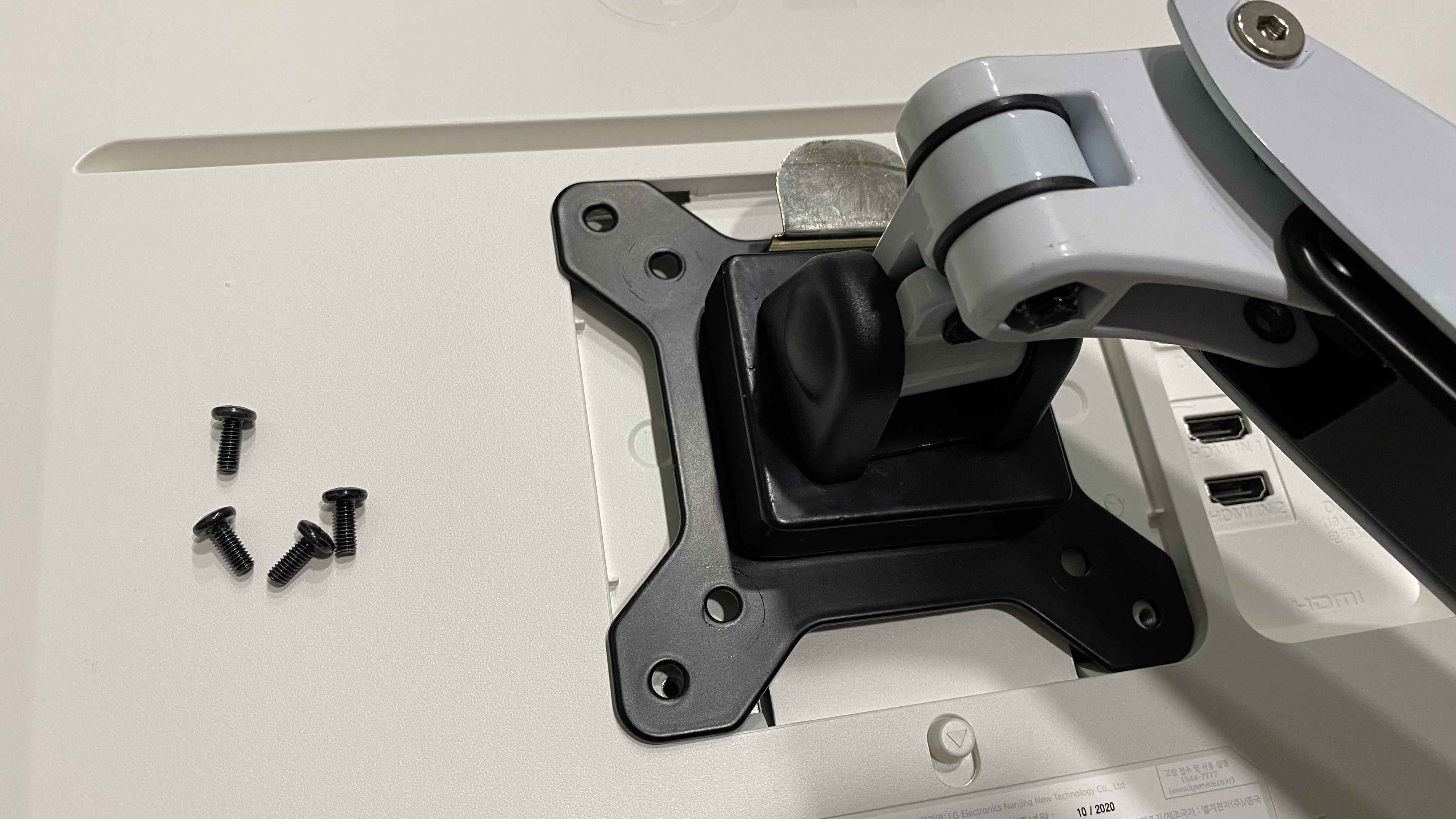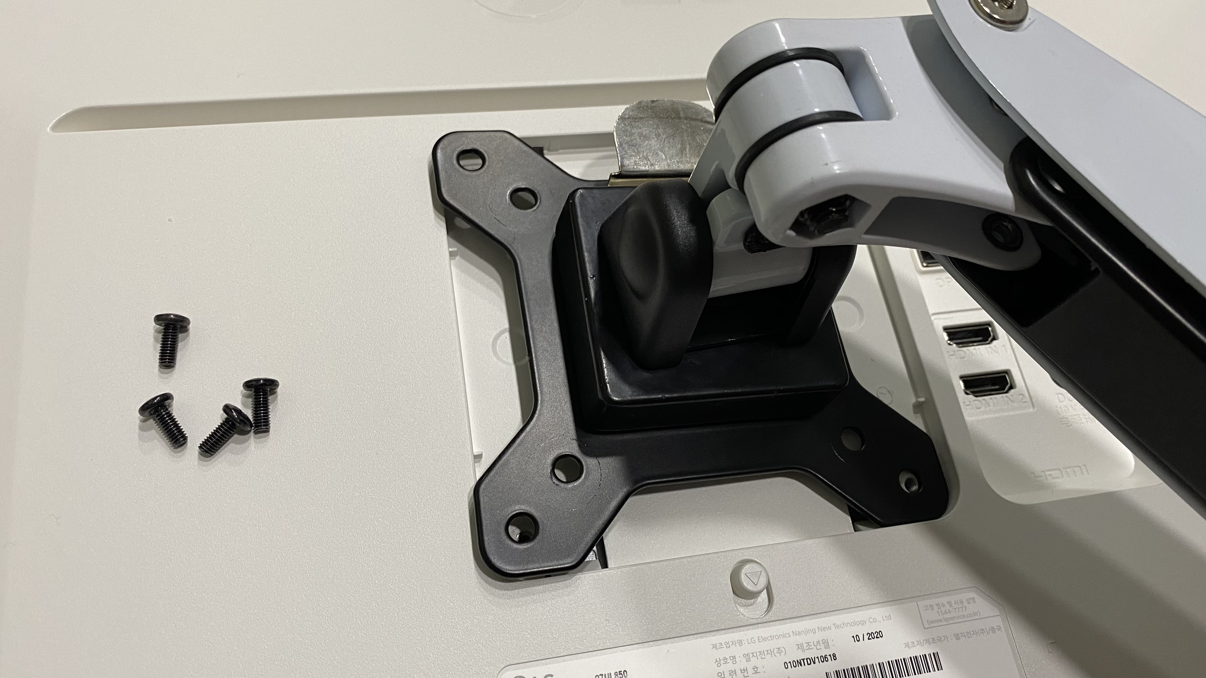 먼저, 위와 같이 원래 꼽혀 있던 나사들을 모두 제거해 줍니다. 모니터 암에 저 나사를 그대로 활용해도 무방합니다.