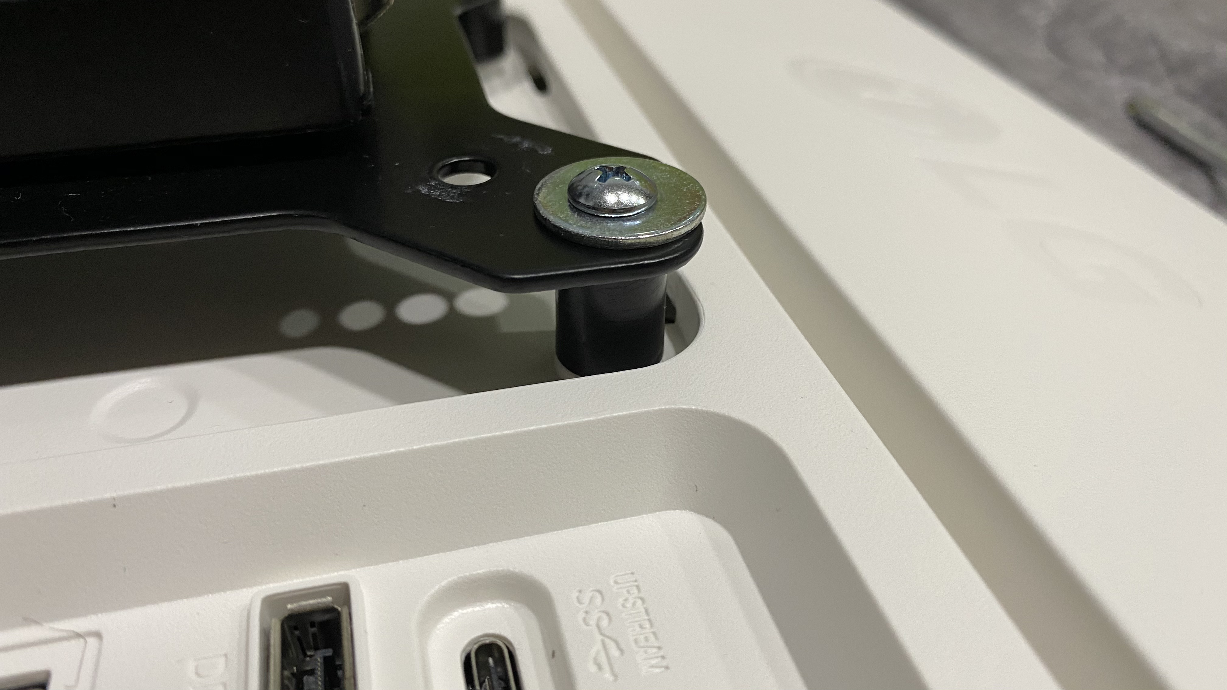 모니터 암을 갖다 데어 봅니다. 우려햇던 것 처럼, 모니터 암의 연결 부위가 홀 안에 들어가지 않습니다. 이대로 장착을 하려면 한쪽은 약간 들뜬 상태로 고정을 해둬야 합니다. (조금 신경쓰이고, 찝찝할 뿐 잘 고정만 시켜둔다면 크게 문제되지는 않습니다.)