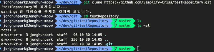 - 우선 앞서 만든 repository를 clone 합니다. 이 repository에는 online/offline 으로 아무런 작업을 하지 않았기 때문에 repository 명 폴더만 생성되면서 clone 될 것입니다.