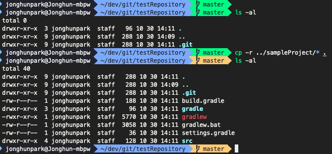 이제 이 프로젝트를 git server에 연결해 보겠습니다. 우선 MacOS 의 터미널이나 iterm2, Windows 의 명령 프롬프트 등을 열어 해당 프로젝트의 최상위 루트로 이동합니다. 그리고 다음을 입력하여 git 프로젝트로 변환합니다.