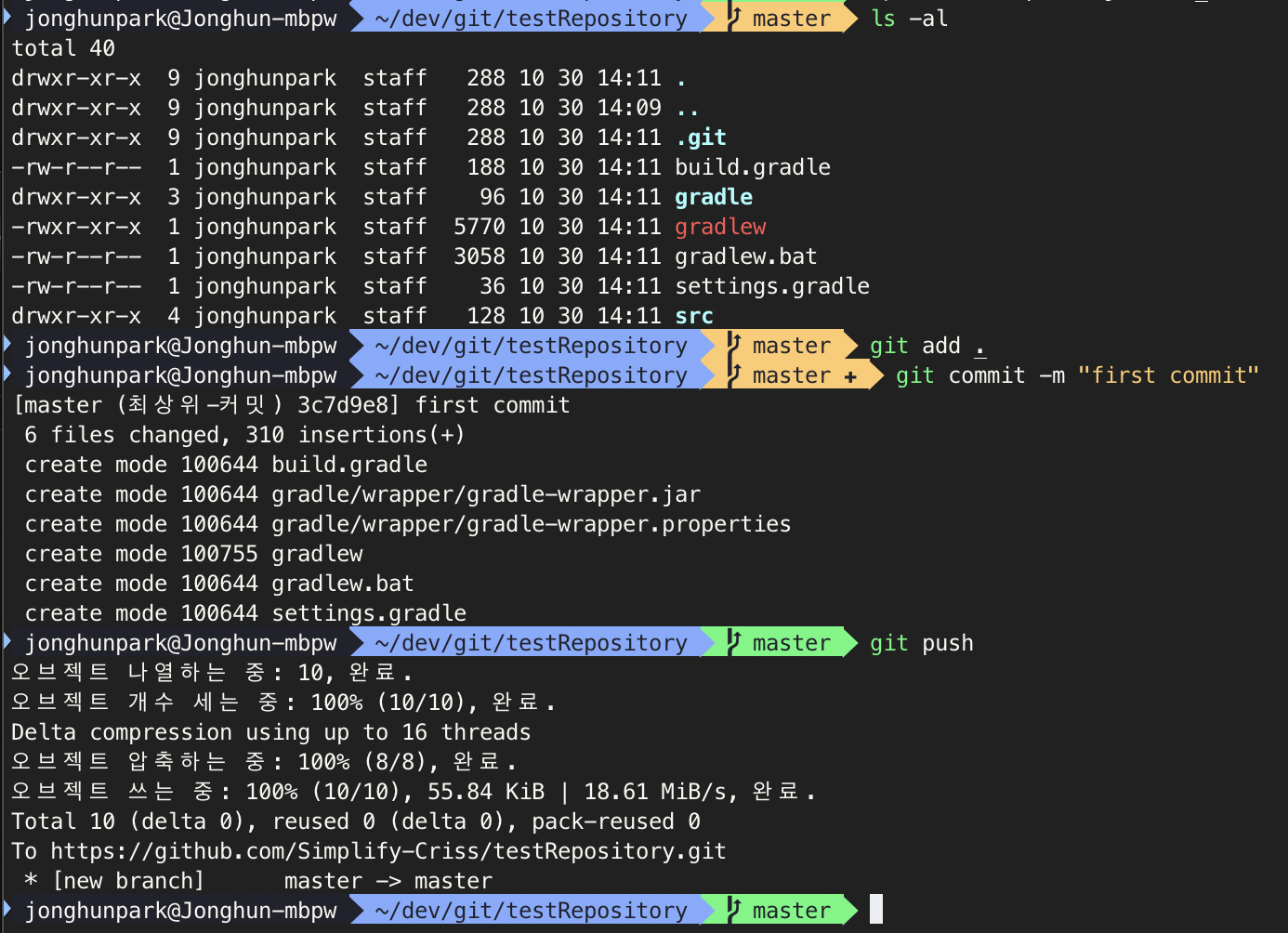 이제 이를 github에 연결하고 push 하려면 다음과 같이 입력합니다.4