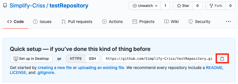 GitHub에서 repository를 생성하면 첫 화면에 주소를 확인할 수 있고, 그 옆에 버튼을 눌러 clipboard에 복사할 수 있습니다(붙여넣기 하면 https 주소가 붙여집니다).