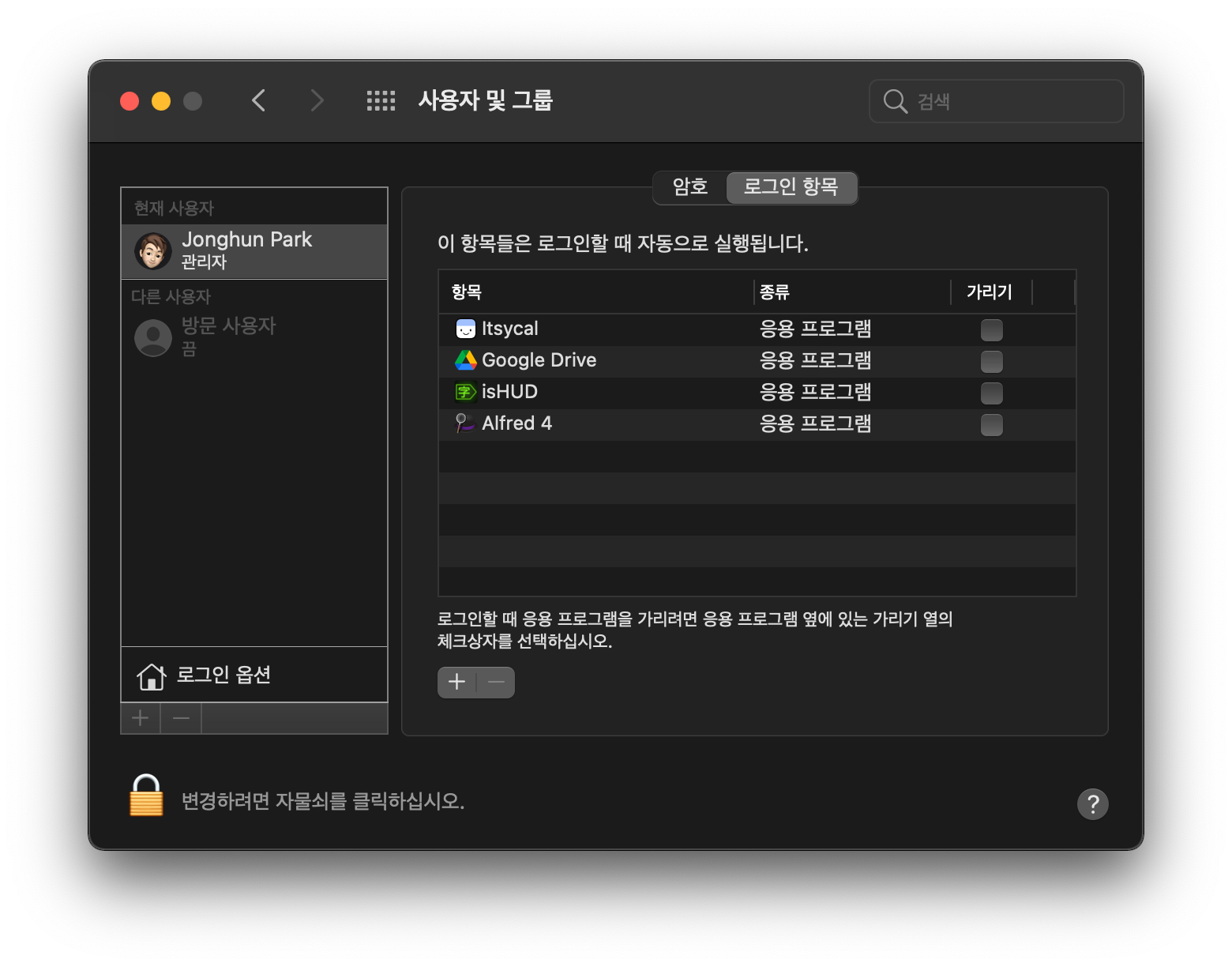 시스템 설정 > 사용자 및 그룹 으로 이동하면 본인이 사용하고 있는 사용자를 비롯하여 여러가지 로그인 옵션이 보이게 되는데, 여기서 로그인 항목 이라는 부분을 선택하면 아래와 같이 시작 시 실행되는 여러 항목들을 확인할 수 있습니다. 저의 경우에는 4개의 프로그램이 보입니다.