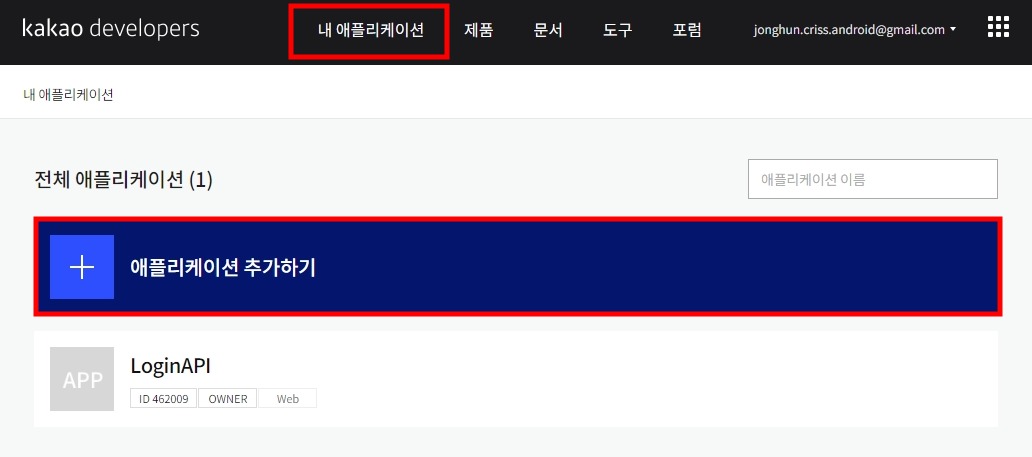 우선 가입을 정상적으로 마치고, 로그인을 하고 나면, 아래 그림에서 처럼, 내 애플리케이션 > 애플리케이션 추가하기 로 진입합니다.