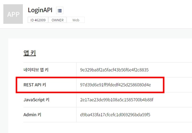 생성하고 나오는 요약정보 에서 아래 표시된 REST API 키 항목에 대한 부분을 잘 적어둡니다.