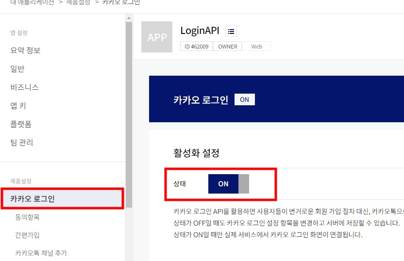 이제 좌측 메뉴 중 카카오 로그인 항목으로 이동하여 활성화 설정 부분을 ON 으로 바꾸어 줍니다.