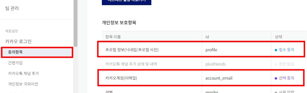 이제 좌측 메뉴 중 동의항목으로 이동하여 프로필 정보와 카카오계정(이메일) 부분을 각각 필수, 선택 동의 항목으로 활성화 해 줍니다.