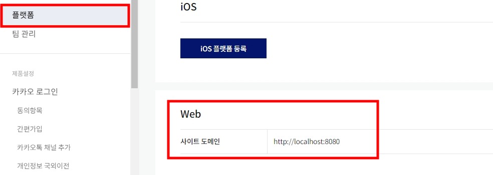 이제 이 API를 사용할 플랫폼이 무엇인지에 대해서 설정을 하게 됩니다. 아래 그림처럼 플랫폼 메뉴로 이동하여 Web항목에 (개발 목적이므로) http://localhost:8080/을 추가해 줍니다.