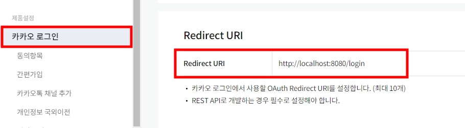 아래와 같이 카카오 로그인 부분으로 다시 이동해서 페이지 아래 쪽으로 내려가다 보면 Redirect URI 를 설정하는 부분이 있습니다. 여기서는 http://localhost:8080/login 으로 설정해 주었습니다.