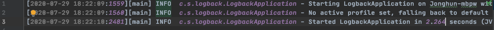 Springboot 에는 기본적으로 logback 이 포함되어 있습니다. 따라서 Springboot 의 *Application.java 파일의 main()함수를 호출하여 실행할 떄, IDE의 console 창에 나타나는 내용이 그것입니다.