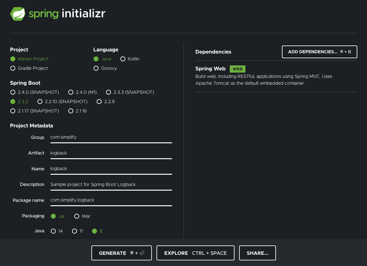 Springboot 프로젝트는 단순히 Spring Initializr를 이용해서 생성하면 됩니다. 해당 페이지에서 아래와 같이 설정값을 적어주고 GENERATE 버튼을 눌러 다운로드 받고, 이를 IntelliJ 등 IDE 환경으로 Import 하면 됩니다.