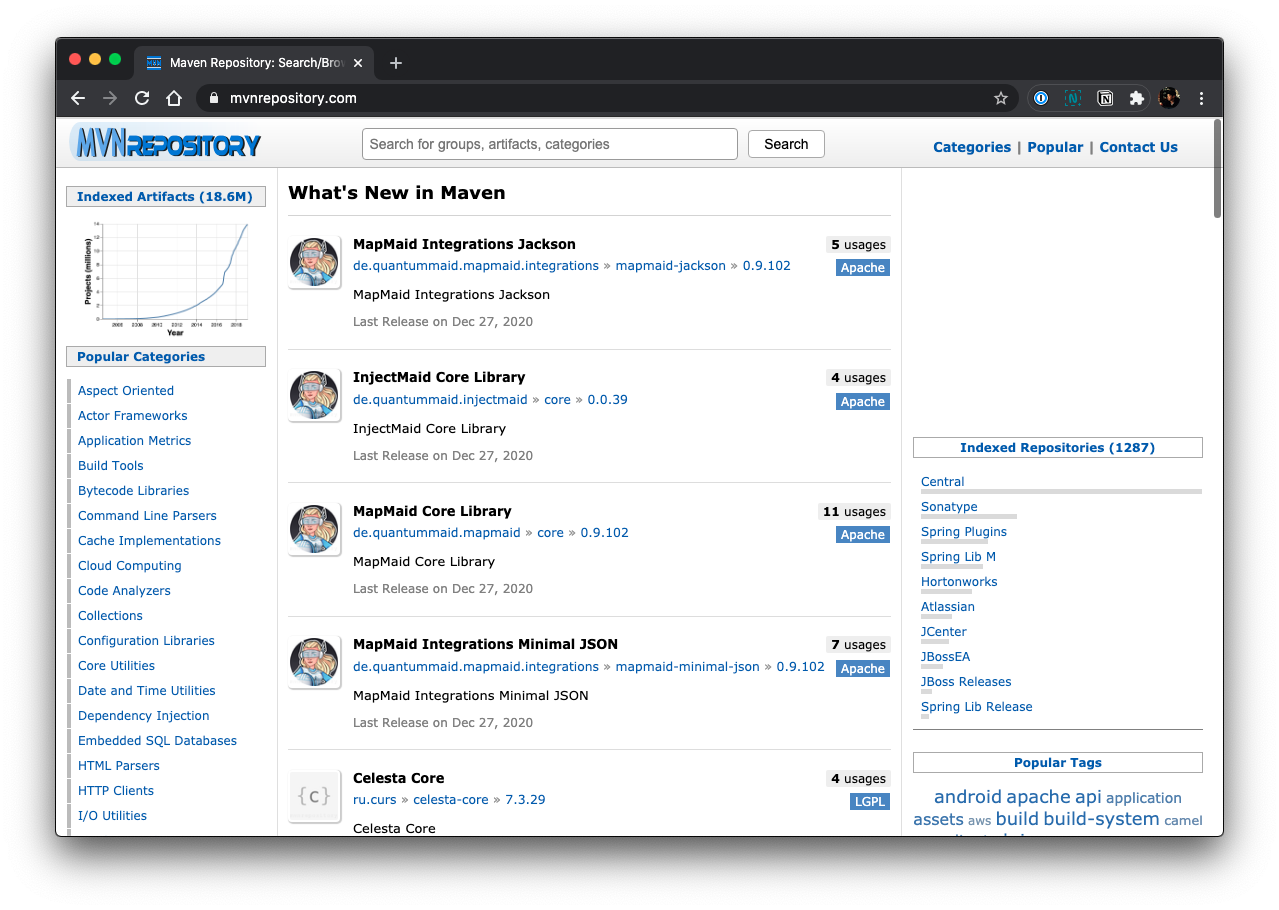 저는 이렇게 알게 된 라이브러리에 대해서 MVN Repository라는 곳에서 찾습니다. 이 곳이 실제 Maven / Grdle이 다운로드 받는 경로가 될 것입니다(mvncentral). 이 페이지에 접속하면 다음과 같은 화면이 나타납니다.