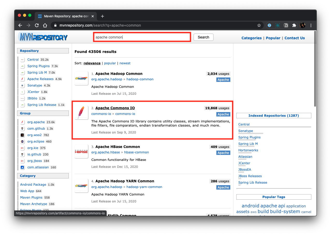 여기서 위 검색창에 찾고자 하는 라이브러리를 검색합니다. 저는 예시로 ‘apache common’ 을 검색하였습니다.