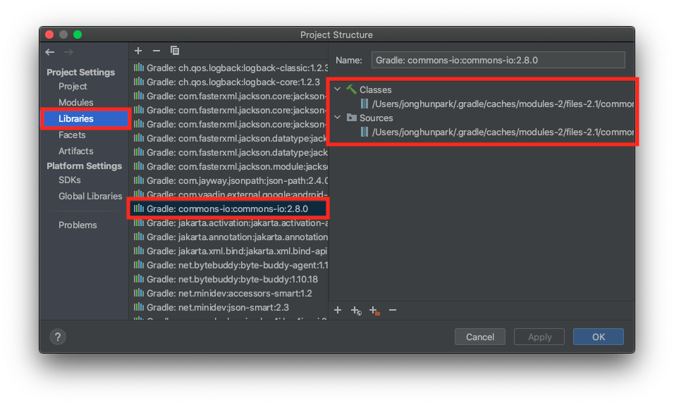IDE에서 Project Structure에 들어가면 다음과 같이 라이브러리의 위치를 확인할 수 있습니다.
