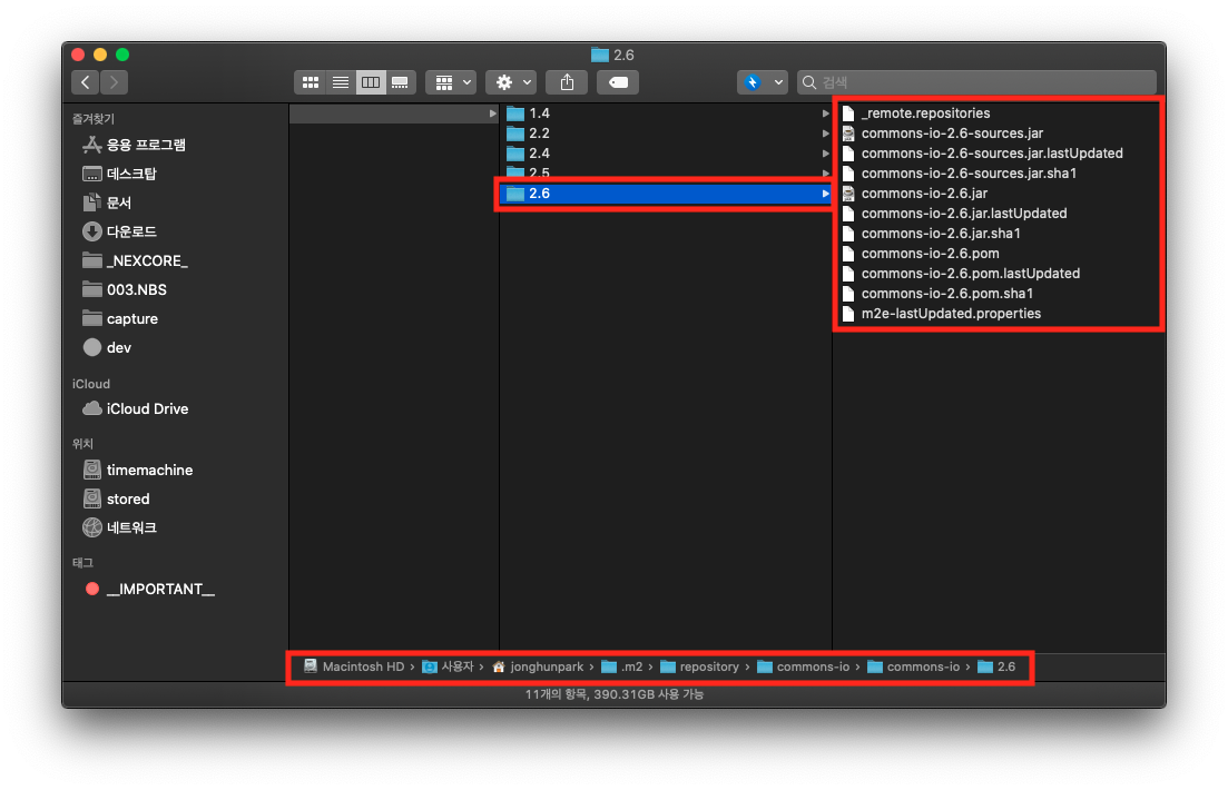 위에서 살펴본 commons-io 와 같은 라이브러리에 대해서 2.6, 2.8 … 등으로 버전이 올라가게 되면 그 하위 버전은 삭제되지 않습니다. 즉, 저 두 폴더는 일반적으로 증가하기만 할 뿐, 줄어들지는 않습니다.