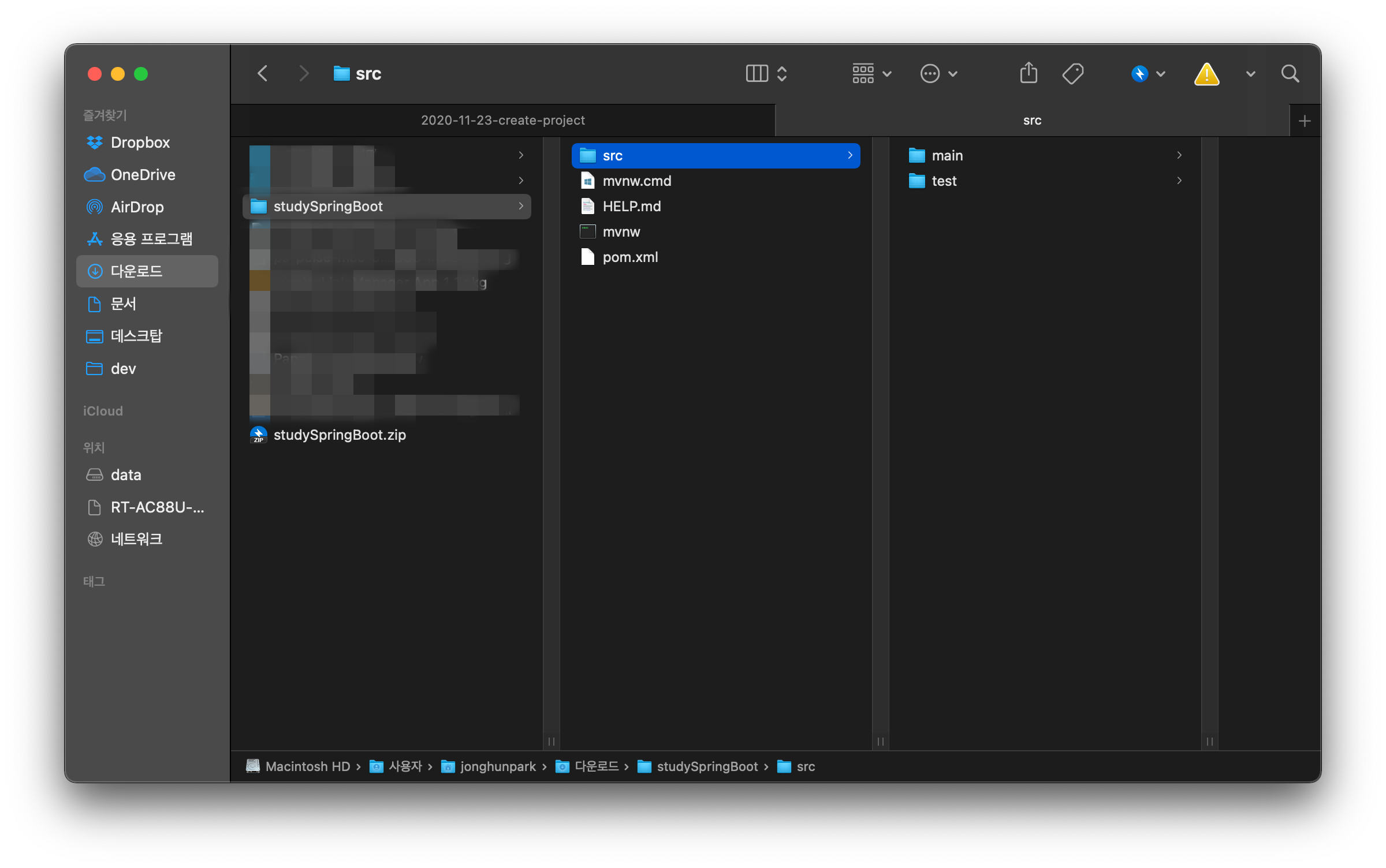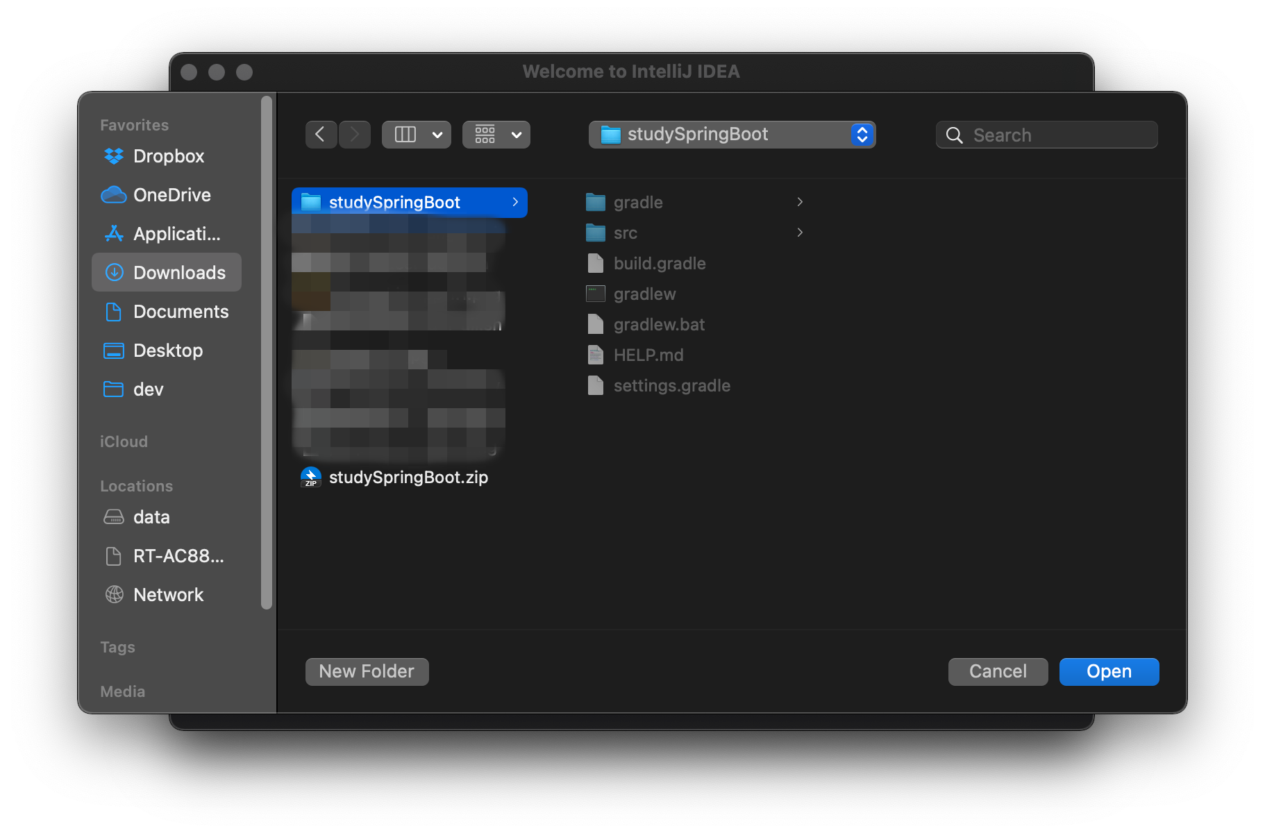 첫 실행 안에서, Open or Import를 선택합니다. 그리고 앞서 Spring Initializr 를 이용하여 생성한 zip 파일을 선택하면, 아래와 같이 에러가 납니다.1 다시 탐색기 혹은 파인더로 돌아와서 아까 생성했던 zip파일의 압축을 풀어줍니다. 그러면 Spring Boot 프로젝트 형태에 맞는, 폴더 구조로 된 하나의 패키지가 나오게 됩니다.