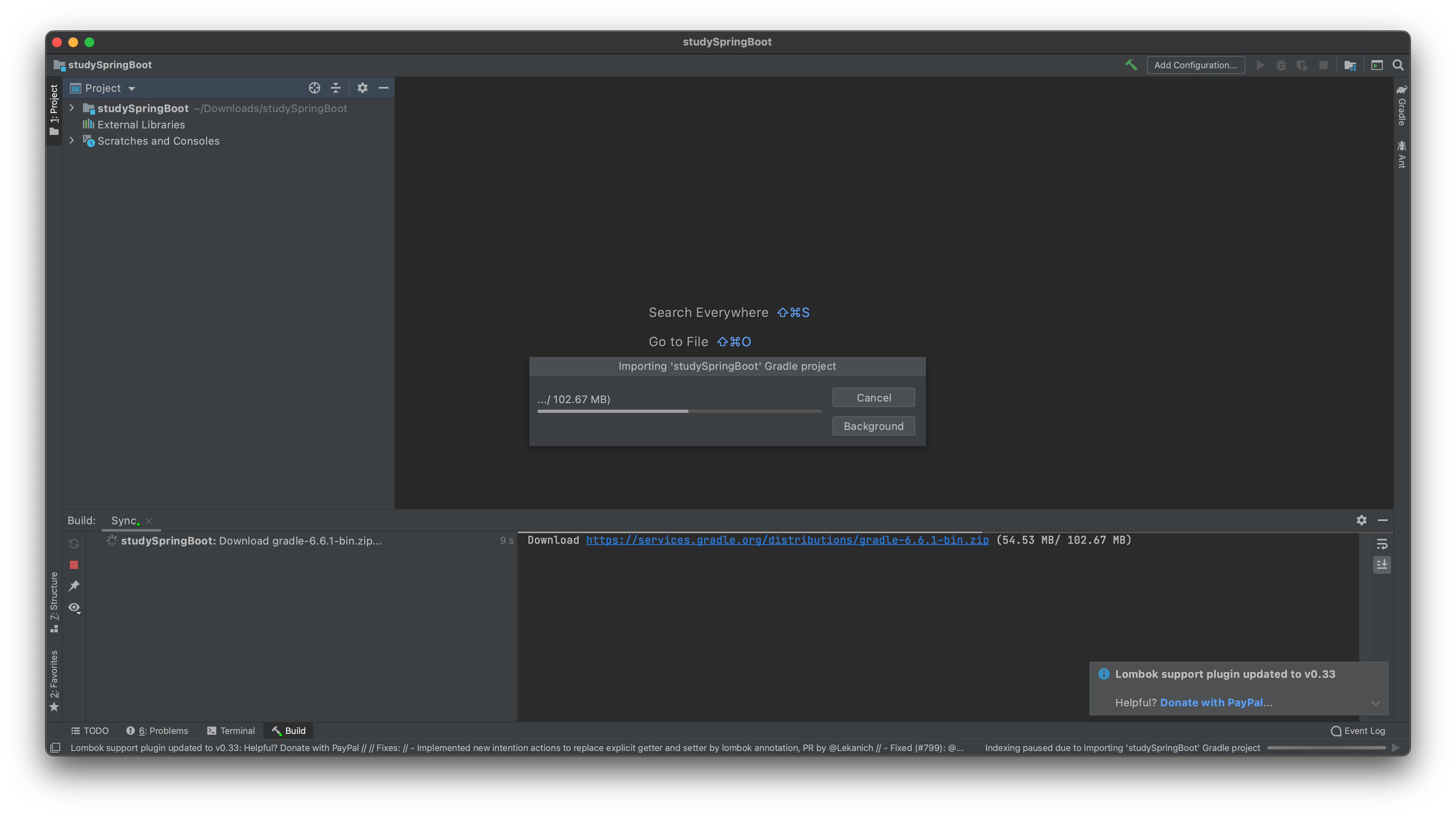 최초 실행하면 아래 그림처럼 조금 기다려줘야 합니다. 이 작업은 모든 IDE에서 동일한 작업이고, 필수 라이브러리들을 다운로드 받는 과정입니다. 여기서는 아마도 Spring Boot 관련 라이브러리들을 다운로드 받을 것이고(별도의 라이브러리는 추가하지 않았습니다), 조금 기다려 주고 대기 상태가 되면 됩니다.