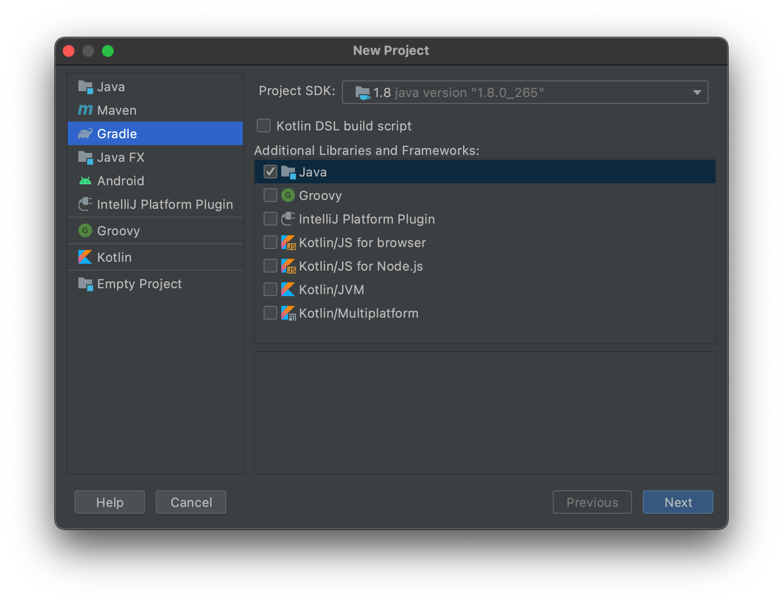 Java언어는 Java / Kotlin / Groovy 를 지원하는 것으로 보입니다. 가장 일반적인 형태인 Java를 선택하겠습니다.