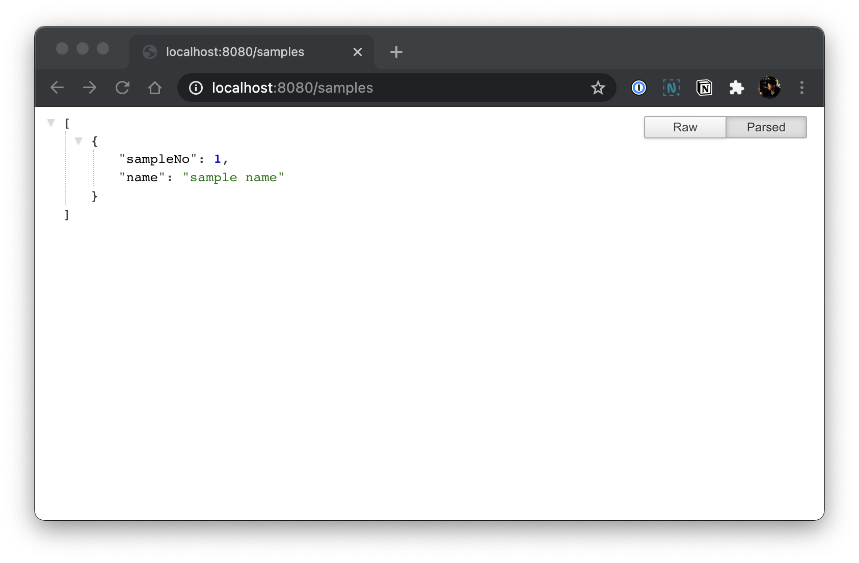 이제 bootRun 을 실행하여 웹 브라우저에 http://localhost:8080/samples 를 호출하면, 아래와 같이 데이터가 JSON 형태로 넘어오는 것을 확인할 수 있습니다.