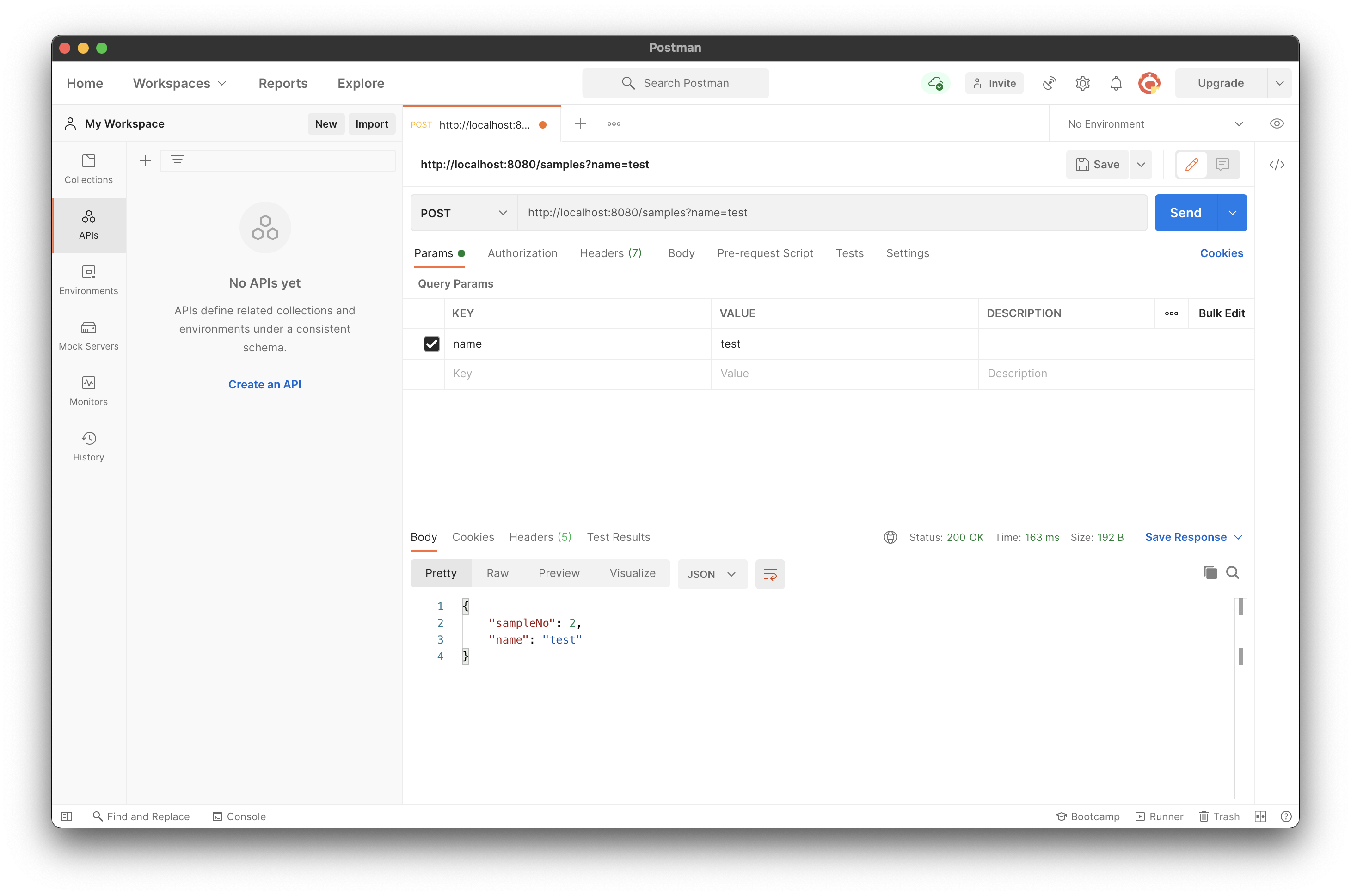 우선 Controller에 Post 방식의 API 를 하나 생성합니다. 여기에 추가로 필요한 정보는 name 뿐입니다. (id 는 자동 생성됩니다) 받은 정보를 그대로 Service로 넘기게 되면 Service에서는 Sample entity 의 builder 를 이용하여 클래스를 생성하고 값을 셋팅하여 repository 의 save 함수를 이용해 값을 저장하게 됩니다.
