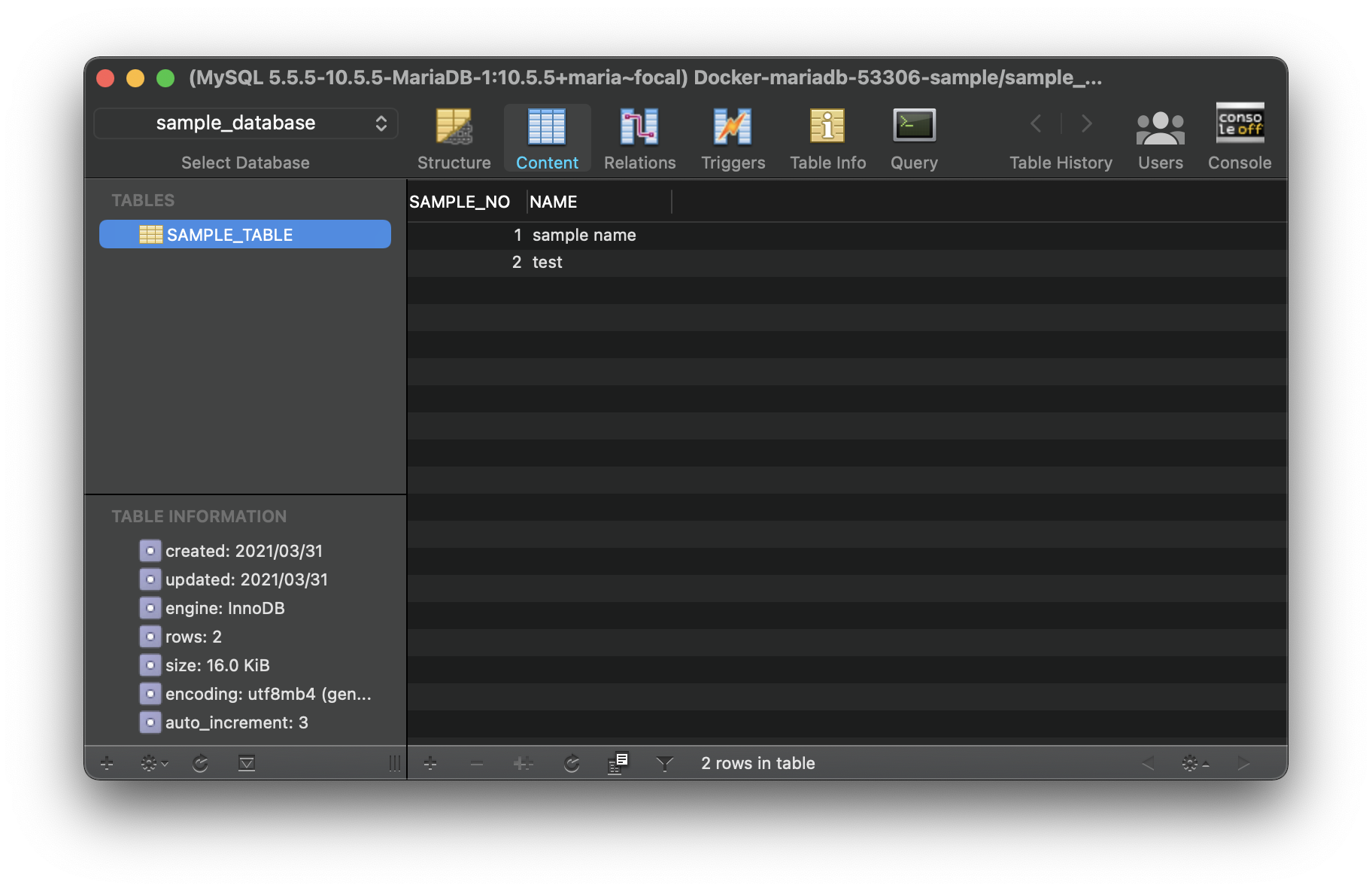 INSERT INTO SAMPLE_TABLE VALUES (1, "sample name");