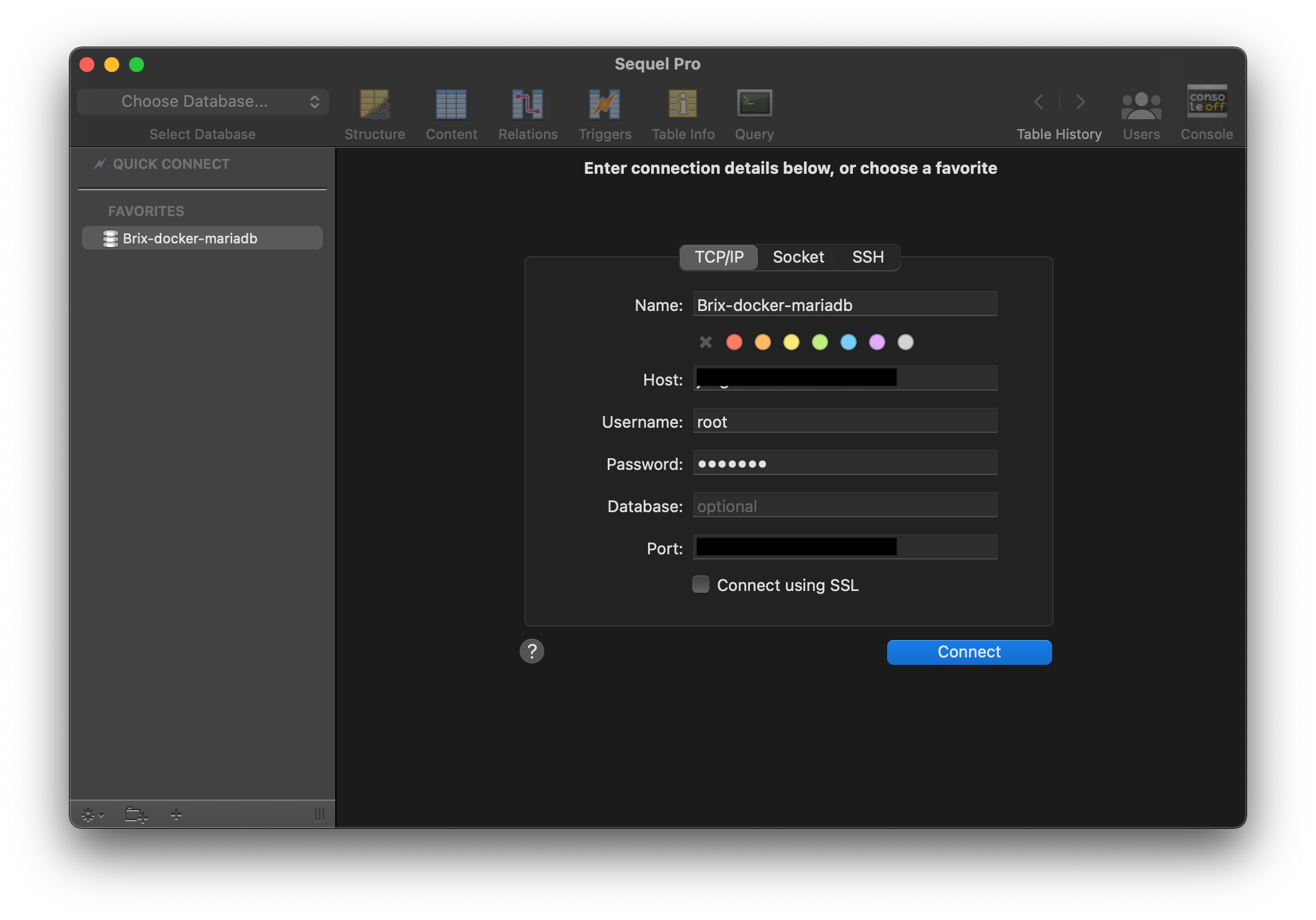 우선 앞서 다운로드 받고 실행해 두었던 docker 형태의 mariadb 에 접속해 보겠습니다. 아래 그림처럼 해당 기기에 대한 정보들을 넣고 접속해 봅니다. 초기 id는 root 이고, 패스워드는 위 docker-compose.yml 파일에 설정한 것이 됩니다. 물론 여기서는 .env 파일을 두고 그 안에 환경변수로 설정하였습니다.